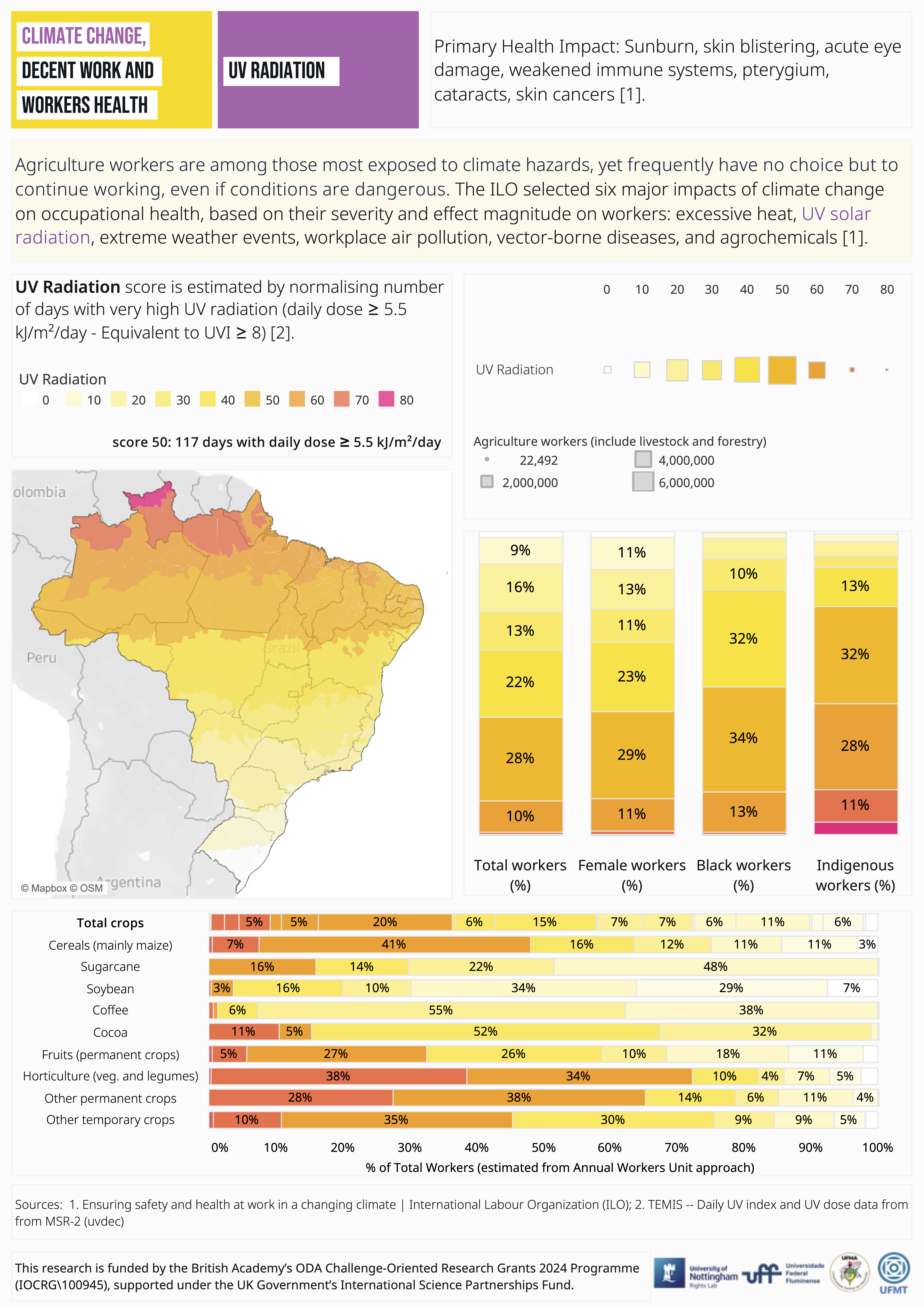 Addressing UV radiation through access to protective clothing, shaded rest areas, adjusted work schedules, and occupational health policies is essential to safeguard workers’ health and uphold decent work standards in agriculture.